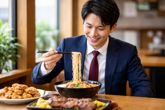 スーツ姿で黙々と爆食する姿に実況トークを盛り込んだスタイルが、多くの視聴者の関心を引いています。